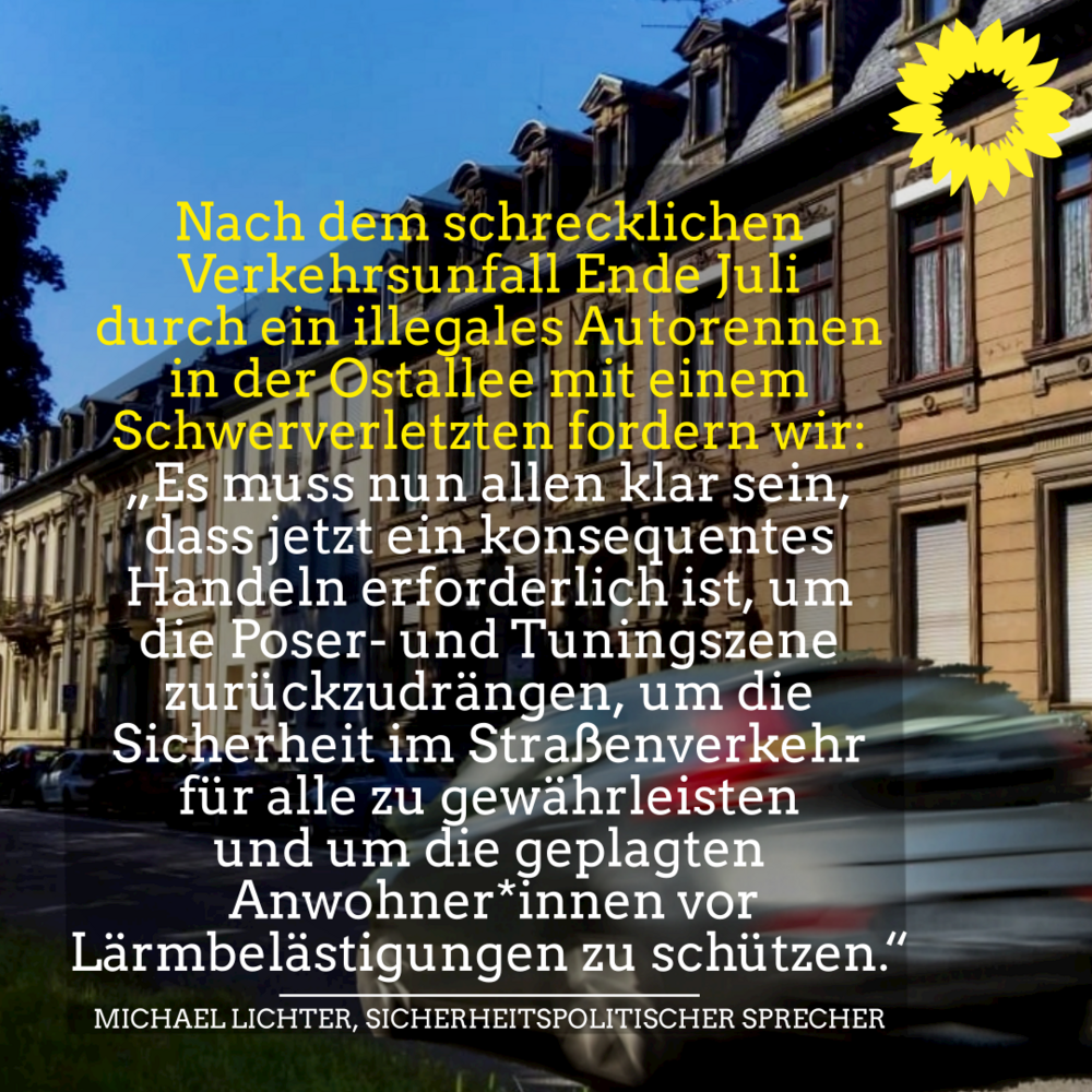 „Wir beobachten seit längerer Zeit mit großer Sorge, wie sich die Poser- und Tuning-Szene in unserer Stadt breit macht und in verantwortungsloser Wild-West-Manier über die Straßen unserer Stadt heizt,“ erklärt Michael Lichter, stellvertretender Fraktionsvorsitzender der Grünen im Trierer Stadtrat und sicherheitspolitischer Sprecher der Fraktion. „Wer am Wochenende oder in den Abendstunden im Bereich des Viehmarkts oder den Moselauen unterwegs ist, kann sich selbst ein Bild davon machen, wie rücksichtlos aufgemotzte oder hochmotorisierte Fahrzeug mit knatternden Motoren und deutlich überhöhten Geschwindigkeiten unterwegs sind. Spätestens aber nach dem schrecklichen Verkehrsunfall Ende Juli in der Ostallee, bei dem ein Mensch nach einem illegalen Autorennen schwer verletzt wurde und der verantwortliche Autofahrer anschließend flüchtete, muss nun allen klar sein, dass jetzt ein konsequentes Handeln erforderlich ist, um die Poser- und Tuningszene zurückzudrängen, um die Sicherheit im Straßenverkehr für alle zu gewährleisten und um die geplagten Anwohner*innen vor Lärmbelästigungen zu schützen.“