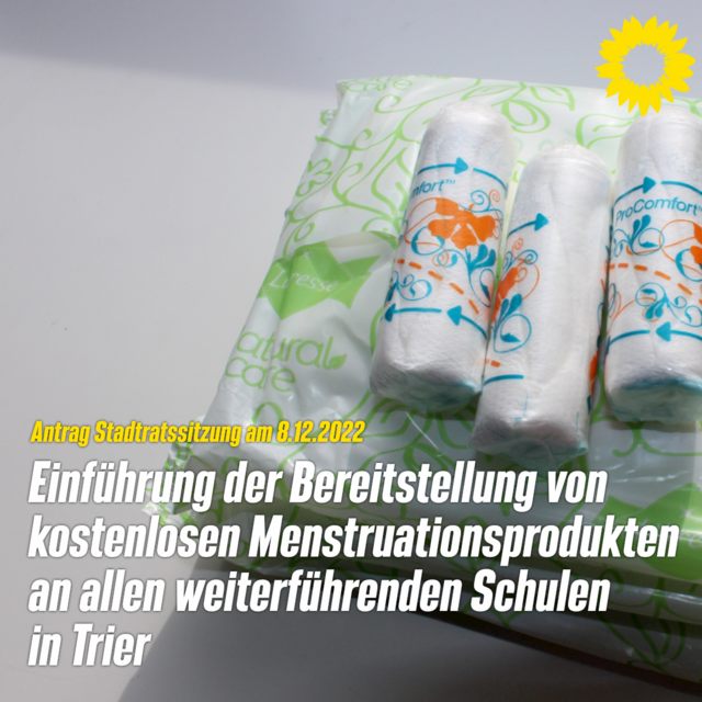 Der Stadtrat möge die Einführung der Bereitstellung von kostenlosen Menstruationsprodukten an allen weiterführenden Schulen in Trier beschließen. Hierbei soll bei der Aufstellung der Automaten darauf geachtet werden, dass diese so platziert werden, dass alle menstruierenden Personen einen einfachen und niedrigschwelligen Zugang zu ihnen haben.