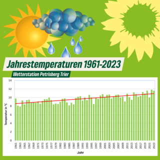 In Trier war es mit 11,6°C Jahresmittel (Wetterstation Petrisberg) sogar noch wärmer – und damit 2,5 Grad über dem Wert 1961 bis 1990. Im Vergleich zur aktuellen und wärmeren Vergleichsperiode 1991 bis 2020 (10,2 °C) betrug das Plus immerhin noch 1,4 Grad. Zudem ist 2023 das 12. zu warme Jahr in Folge. Besonders erschreckend: Seit 2008 steht die 2 vor dem Komma (Ausnahme 2021).
