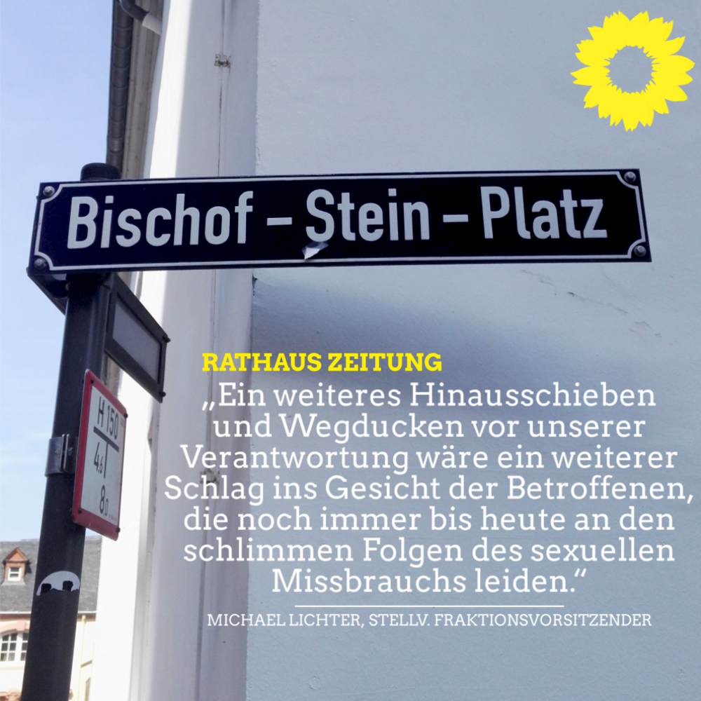 Die Experten-Anhörung in der Stadtratssitzung vom Januar hat bestätigt, dass Bischof Stein in seiner Amtszeit zwischen 1967 und 1980 sexuellen Missbrauch durch katholische Geistliche im Bistum Trier gedeckt und so weiter ermöglicht hat. Ein solcher Mensch hat es nicht verdient, dass zu seinen Ehren auch noch ein Platz benannt ist. Daher ist es nun höchste Zeit, ein symbolisches Zeichen zu setzen und dies zu ändern.