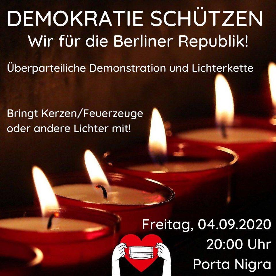 Wir rufen als Teil eines überparteilichen Bündnisses auf zur gemeinsamen Demonstration für Demokratie und die Berliner Republik. Wir stehen zu unserer Berliner Republik, zu unserer parlamentarischen Verfassung und unseren Grundrechten. Wir wollen die Straße nicht Rechtsextremen, Verschwörungstheoretikern und Anti-Demokrat*innen überlassen, die sich unter dem Deckmantel der Corona-Kritik gegen unser Gemeinwesen richten.