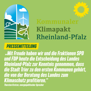 Mit Freude haben die Fraktionen von Bündnis 90/DIE GRÜNEN, SPD und FDP heute die Entscheidung des Landes Rheinland-Pfalz zur Kenntnis genommen, dass die Stadt Trier zu den ersten Kommunen gehört, die von der Beratung des Landes zum Klimaschutz profitieren. Die Aufnahme in den Klimapakt des Landes ist ein großer Erfolg für Trier.