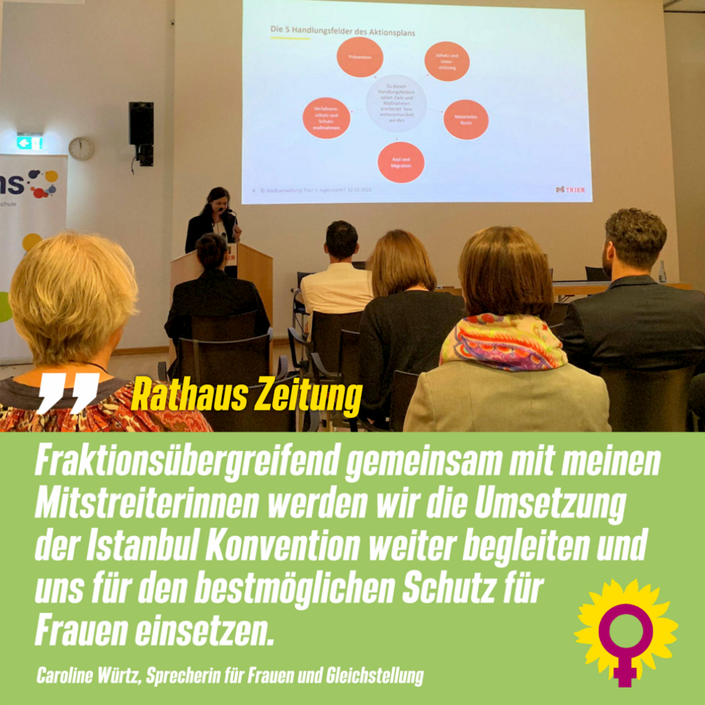 Es gibt viel zu tun, bis auch in Trier die Istanbul Konvention umgesetzt ist! Sei es das Frauenhaus, das dringend barrierefrei werden muss und mehr Plätze benötigt. Seien es die einzelnen Beratungs- und Interventionsstellen, die mehr Ressourcen brauchen, um angemessene Öffentlichkeitsarbeit leisten zu können. Seien es die dringend benötigten höheren finanziellen und personellen Ressourcen in Bezug auf Präventionsmaßnahmen und Programme für Täter, die ihr gewalttätiges Verhalten ändern wollen.