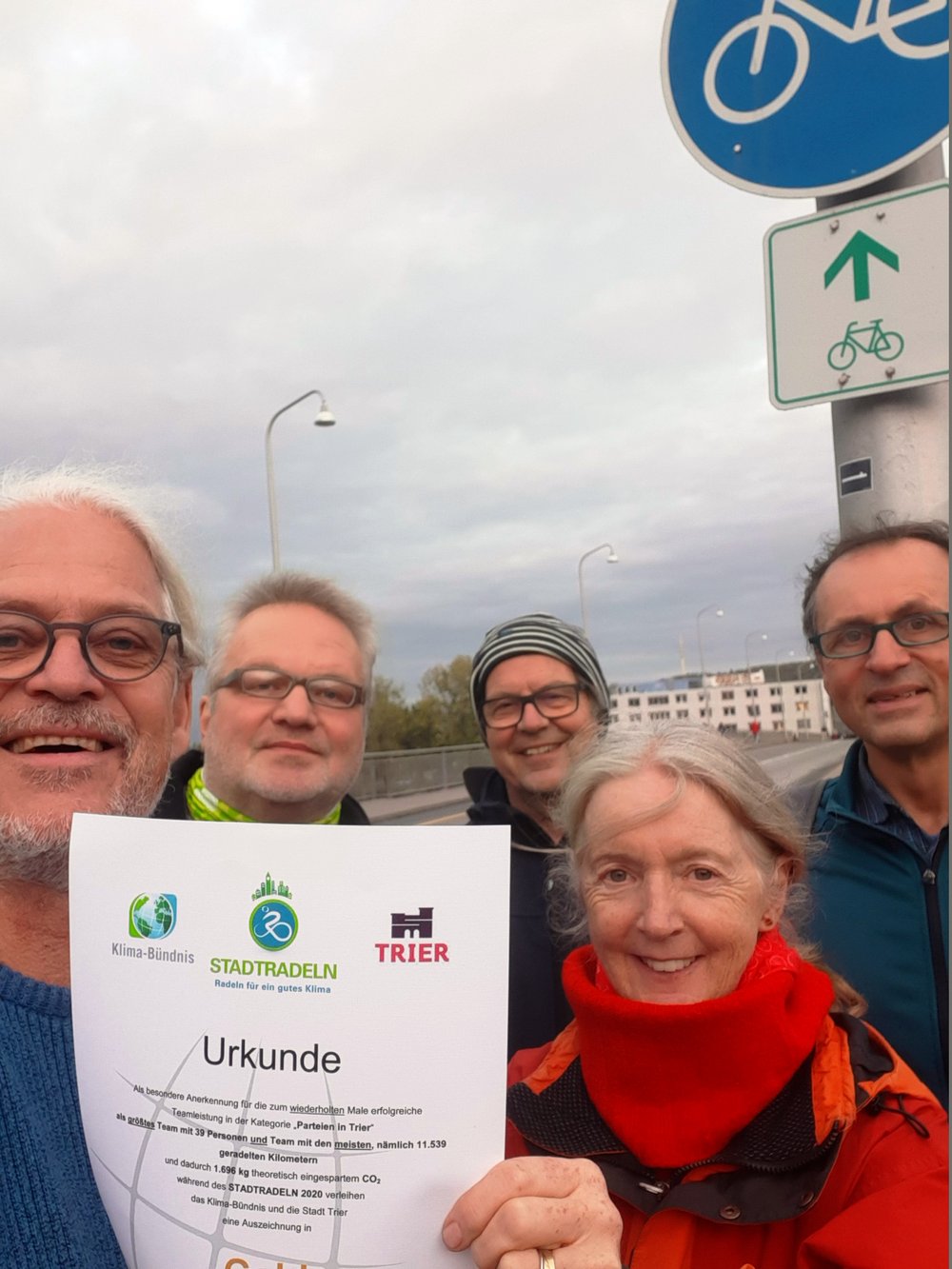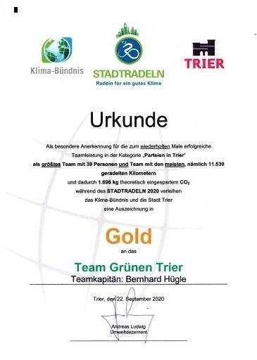 Wir reden nicht nur von der Mobilitätswende, wir machen und fahren so allen davon: Unser Team Grüne Trier hat beim Stadtradeln 2020 zum wiederholten Mal die Auszeichnung in GOLD als bestes Team in der Kategorie „Parteien in Trier“ gewonnen – und das gleich in zwei Punkten: Als größtes Team und als Team mit den meisten, nämlich 11.539 geradelten Kilometern. Dadurch haben unsere Fahrradfahrer*innen 1696 kg CO2 eingespart. Insgesamt haben wir uns bei den Gruppen auf Platz 6 hochgestrampelt.