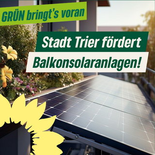 Ab sofort könnt ihr ganz einfach auch als Mieter*in euren eigenen Strom erzeugen. Denn unsere Stadt Trier bezuschusst die Installation von Balkonsolaranlagen. Die Förderung beträgt jeweils 200 Euro. Ein Erfolg unserer GRÜNEN Stadtratsfraktion!