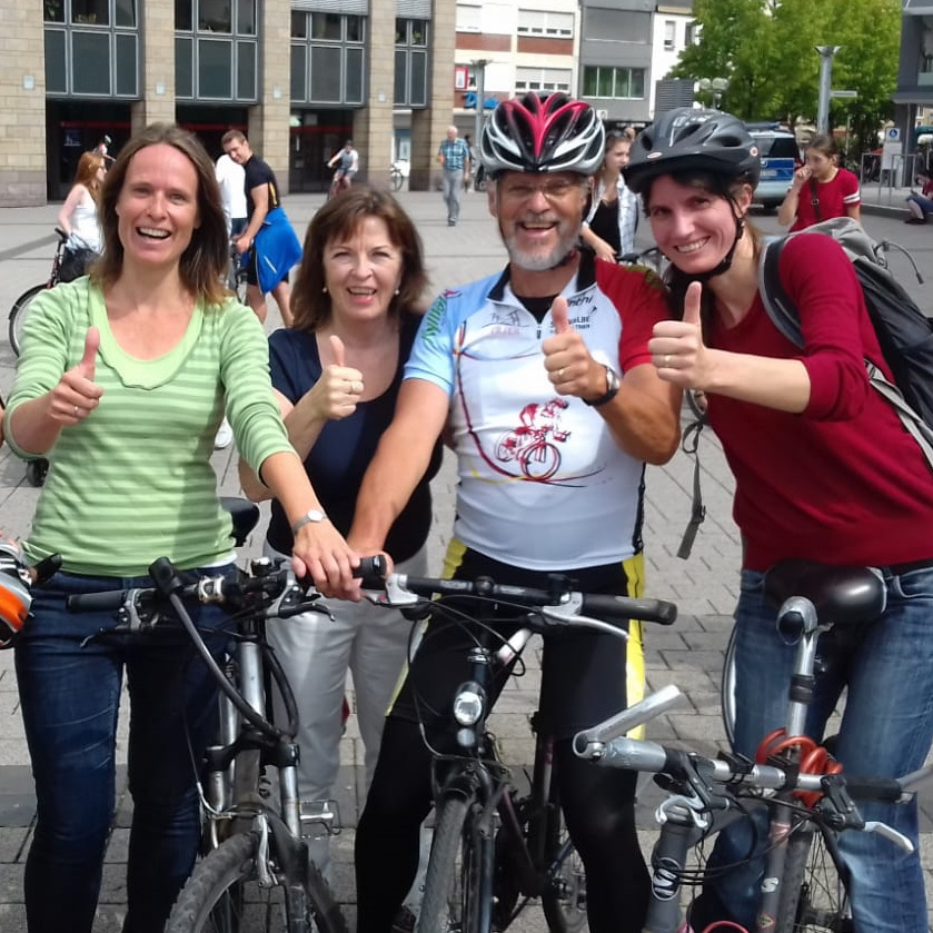 Die anschließende Tour zur Arena bei Autoverkehr in der Gegenrichtung machte endgültig klar: Radfahren und motorisierter Verkehr passen zusammen – wenn wir das Tempo rausnehmen und aufeinander Rücksicht nehmen. Hören wir auf, Radler*innen auf schlecht markierte, viel zu enge Streifen oder in umwegige Nebenstraßen abzuschieben. So, wie wir Menschen mit Behinderung nicht in geschlossene Räume abschieben, sondern gleichberechtigt am öffentlichen Leben teilhaben lassen.