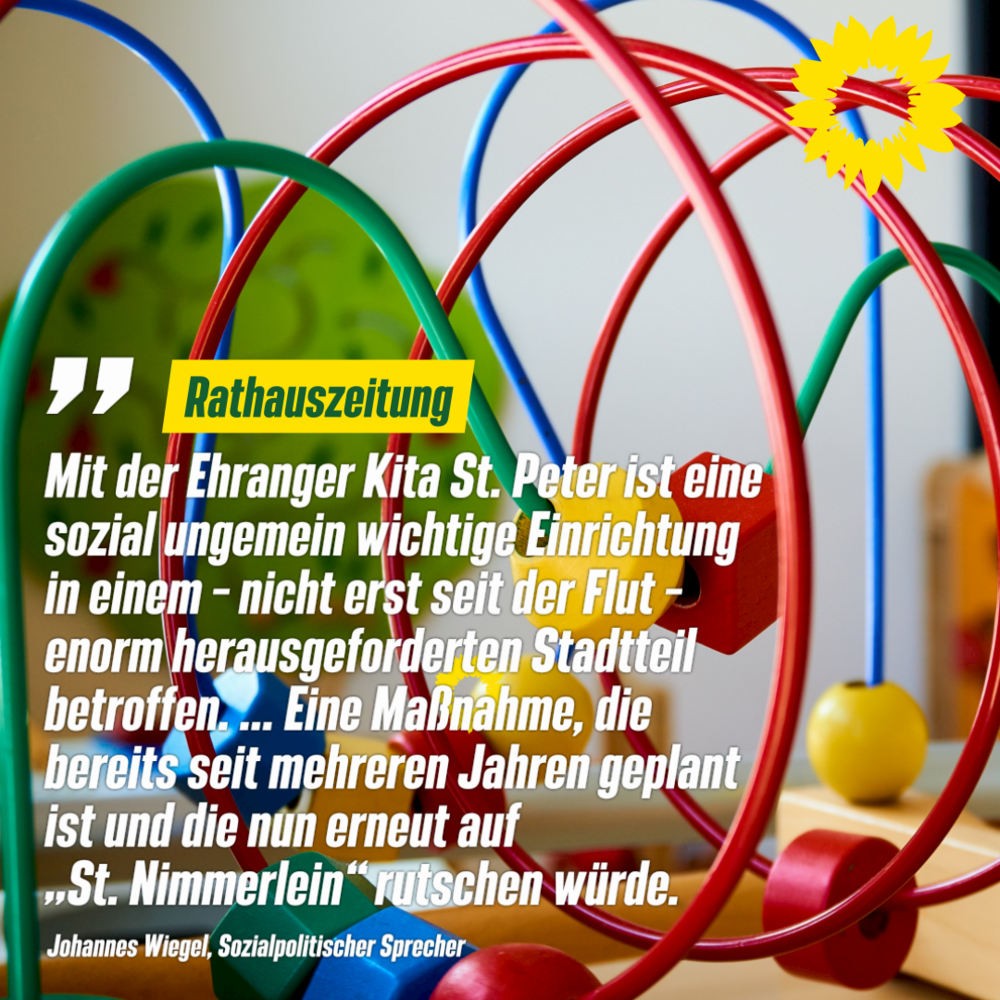 Mit der Ehranger Kita St. Peter ist zum Beispiel eine sozial ungemein wichtige Einrichtung in einem – nicht erst seit der Flut – enorm herausgeforderten Stadtteil betroffen. Dort sollen fünf Gruppen „Unter Gerst“ hergerichtet werden. Eine Maßnahme, die bereits seit mehreren Jahren geplant ist und die nun erneut auf „St. Nimmerlein“ rutschen würde.