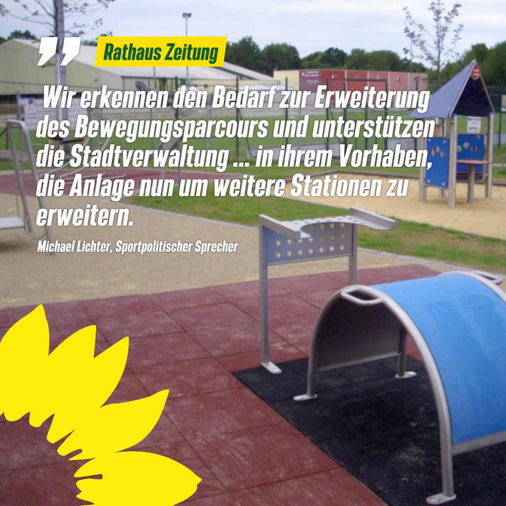 Wir erkennen daher den Bedarf zur Erweiterung des Bewegungsparcours an. Und wir unterstützen die Stadtverwaltung bei den noch anstehenden Beratungen und Abstimmungen in den Ausschüssen sowie in der kommenden Stadtratssitzung im Juli in ihrem Vorhaben, die Anlage nun um weitere Stationen zu erweitern. Unter anderem sollen eine Balancierstrecke, ein Oberkörper-Ergometer und eine Pedalostrecke hinzukommen.