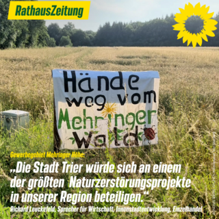 Aber was sind die Folgen? Die Stadt Trier würde sich an einem der größten Naturzerstörungsprojekte in unserer Region beteiligen. Die Stadt Trier hätte im Rahmen einer voraussichtlichen Minderheitsbeteiligung im Zweckverband kaum Einflussmöglichkeiten auf Nutzung und Ansiedlung in diesem Gebiet.