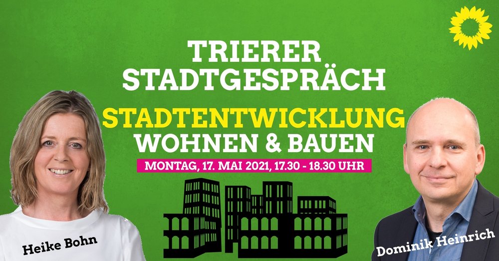Darüber und auch über Eure Ideen und Vorstellungen möchten wir mit euch und unseren unsere Fraktionsmitgliedern Heike Bohn und Dominik Heinrich diskutieren im zweiten Trierer Stadtgespräch „Bauen & Wohnen“ zur Stadtentwicklung am Montag, 17. Mai, von 17.30 bis 18.30 Uhr. Falls ihr jetzt schon Fragen habt, schickt sie an gruene.im.rat@trier.de.