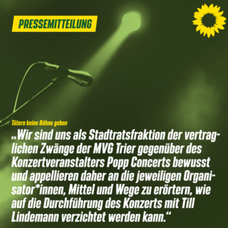 In den vergangenen Tagen sind die Forderungen, das Konzert von Till Lindemann am 20. November 2023 in der Arena in Trier abzusagen, immer lauter geworden. Unter anderem haben die Feministische Vernetzung und der Frauennotruf Trier hierzu eine Mailaktion gestartet. Wir als Fraktion Bündnis 90/die Grünen unterstützen die darin enthaltenen Forderungen ausdrücklich.