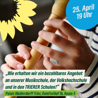 „Wie erhalten wir ein bezahlbares Angebot an unserer Musikschule, der Volkshochschule und in den TRIERER Schulen? - Die Folgen der Rechtsprechung des Bundes Sozialgerichts zu Honorarverträgen in Musikschulen“ ist Thema der Podiumsdiskussion der Fraktion Bündnis 90 / Die Grünen im Stadtrat Trier. Die Veranstaltung findet statt am Donnerstag, 25. April 2024, um 19 Uhr im Palais Walderdorff, Raum 5, Domfreihof 1b, 54290 Trier.