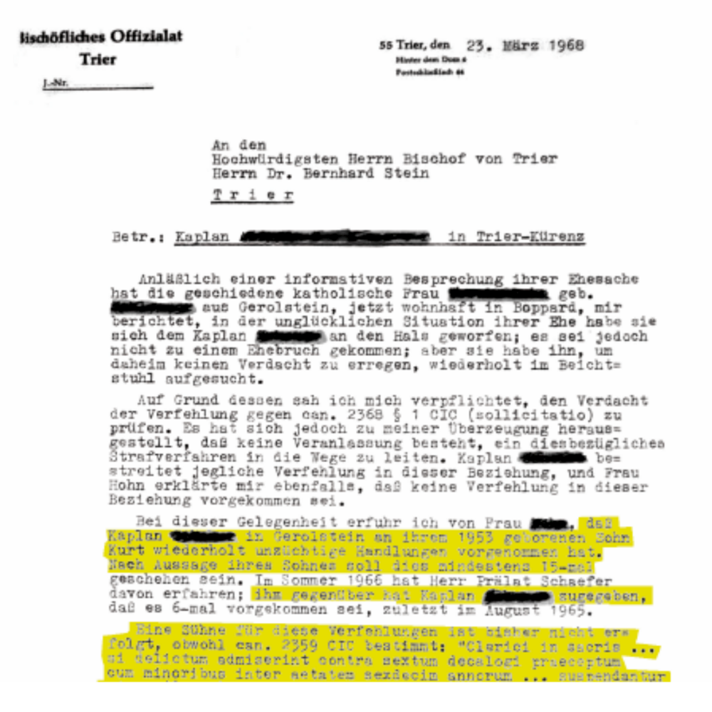 Die Reaktion von Bischof Stein am 1. Juli 1968: Er versetzt den Missbrauchstäter 3 Monate später in eine neue Pfarrei. Eine Bestrafung fand nicht statt. Der Missbrauch wurde sogar fortgesetzt.