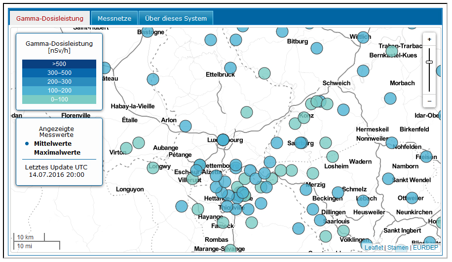 Auf einer Online-Karte werden stündlich die Daten von rund 300 Messstationen in Rheinland-Pfalz, dem Saarland sowie in den Nachbarländer Frankreich, Belgien und Luxemburg dargestellt. Auch die Umgebung der grenznahen Atomkraftwerke Cattenom oder Tihange wird mit den Messwerten abgebildet.