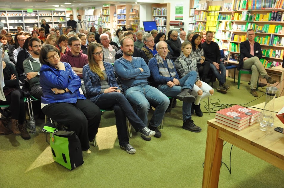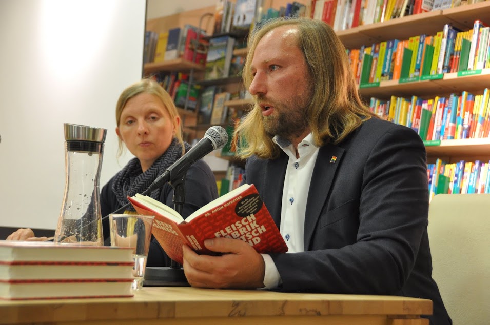 Obwohl die Buchhandlung Stephanus ihren Saal bis zum Anschlag mit Stühlen füllte und auch noch Stehplätze zuließ, mussten mehrere Dutzend Interessierte draußen bleiben. So groß war das Interesse an dem Buch "Fleischfabrik Deutschland" und dessen Autor Anton Hofreiter, der sich um die Spitzenkandidatur zur Bundestagswahl bewirbt.