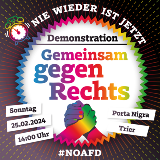 Mehr als 10.000 Menschen haben am 28.01. in Trier gegen die menschenverachtende AfD demonstriert - ein historischer Tag! Einen Monat seit den Correctiv-Enthüllungen, gehen bundesweit weiter Hunderttausende gegen Rechts auf die Straße. Ein neuer Höhepunkt des Protests soll das Aktionswochenende „Zusammen gegen Rechts“ vom 23.-25.2. werden. Deshalb wollen auch wir am 25.2. erneut in Trier demonstrieren!
