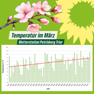 Der dritte Monat im Jahr 2024 ist auch der dritte deutlich zu warme. Deshalb stehen wir GRÜNE für eine konsequente Klimaanpassungspolitik, damit sich die Bürger*innen und Gäste in Trier wohlfühlen können. Und wir stehen für eine ebenso konsequente Klimaschutzpolitik. Wir hier in Trier können dazu beitragen, das Klima zu schützen und die Folgen der Klimaveränderung hier vor Ort abzumildern.