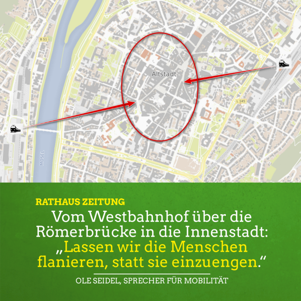 2024 wird der Westbahnhof eröffnet, Personenzüge fahren endlich wieder auf der Westtrasse. Menschen aus Wittlich, Hetzerath, Föhren, Schweich werden mit dem Zug kommen, am neuen Westbahnhof aussteigen, über die Römerbrücke laufen und von dort aus weiter in die Innenstadt. Für Rathaus, Theater, Europahalle, Viehmarkt, Fleischstraße, Kornmarkt, Handwerkerbrunnen wird der Westbahnhof die kürzeste fußläufige Verbindung.