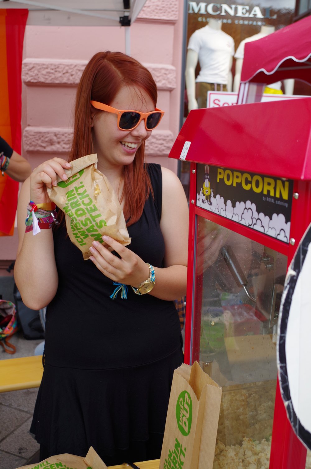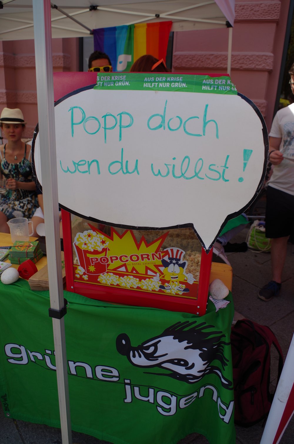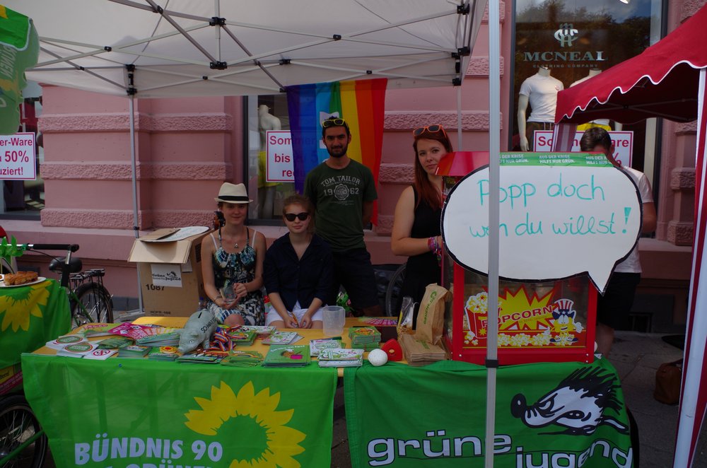 Die Grüne Jugend verteilte den ganzen Tag über Popcorn - für freie Liebe, die Ehe für alle, das volle Adoptionsrecht für gleichgeschlechtliche Paare und gegen Homophobie: "Wir wollen mehr Toleranz, wir wollen die Ehe für alle und das volle Adoptionsrecht für gleichgeschlechtliche Paare. In vielen europäischen Ländern gibt es beireits die Ehe bei gleichgeschlechtlichen Paaren mit den vollen Rechten, in Österreich wurde erst im Januar 2015 das volle Adoptionsrecht für gleichgeschlechtliche Paare eingeführt. Deutschland beweg dich!"