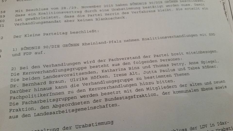 Eine Umsetzungsstrategie für unsere Ziele entwickeln, unsere Strukturen, unsere Kommunikation und Zusammenarbeit als Partei sowie unsere Arbeits- und Diskussionskultur mit unseren Erfahrungen aus den vergangenen Jahren weiter entwickeln - darum soll es bei einem GRÜNEN Kongress gehen. Die Delegierten auf dem Kleinen Parteitag votierten einstimmig dafür, einen solchen Programm- und Profilierungsprozess in Gang zu setzen. Zuvor wollen die Grünen in Rheinland-Pfalz in Verhandlungen über eine Koalition mit SPD und FDP treten. Das haben die Delegierten mit einer Gegenstimme beschlossen.