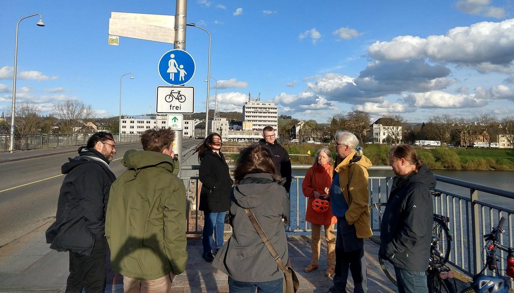 Wir kommen zu euch! Diesmal war der Grüne Stammtisch in Trier-West. Eingestiegen sind wir mit einem Vor-Orttermin am neu gestalteten Römerbrückenkopf. „Die jetzige Verkehrsführung auf der Römerbrücke entspricht bei weitem nicht unseren Vorstellungen und Zielsetzungen“, erklärt Bernhard Hügle, stellvertretender Ortsvorsteher und Sprecher für Mobilität in der Stadtratsfraktion. „Unabhängig davon, dass es einen Beschluss des Stadtrates gibt, langfristig die Verkehrsführung auf der Römerbrücke frei vom individuellen Autoverkehr zu gestalten, sind - ebenfalls vom Stadtrat beschlossen - beidseitige Radfahrstreifen eine geplante Zwischenlösung. Für diese müsste eine der beiden Fahrbahnen vor der östlichen Ampel entfallen.“ Dann aber befürchte die Verwaltung, dass sich der Verkehr auf der Brücke bis in den neu erstellten Kreisel auf der westlichen Seite staue.