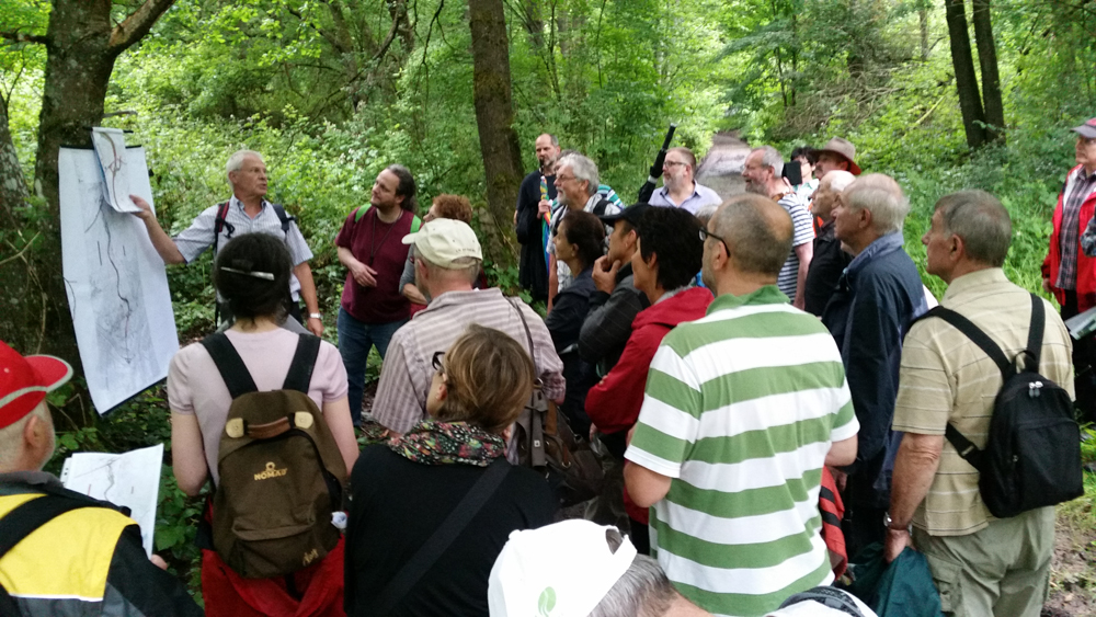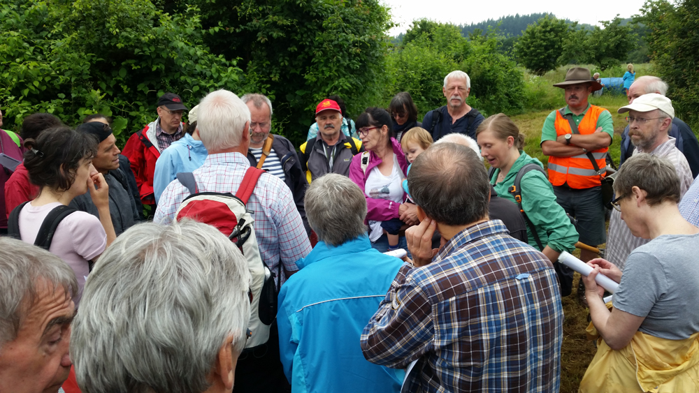 Richard May, Vorsitzender der Bürgerinitiative hat die Pläne im Großformat unter dem Arm geklemmt. Alle Kilometer macht er Halt, pinnt die Pläne an einen Jägerstand oder einen Baum und spricht von Auffahrten, Brücken und Aufschüttungen. Die Zuhörer*innen verfolgen die Ausführungen beinahe ungläubig. Kaum vorstellbar, dass Wiesen und Wald in ein paar Jahren einfach weg sein sollen und stattdessen eine Betonschneise diese wunderschöne Landschaft verschandelt.