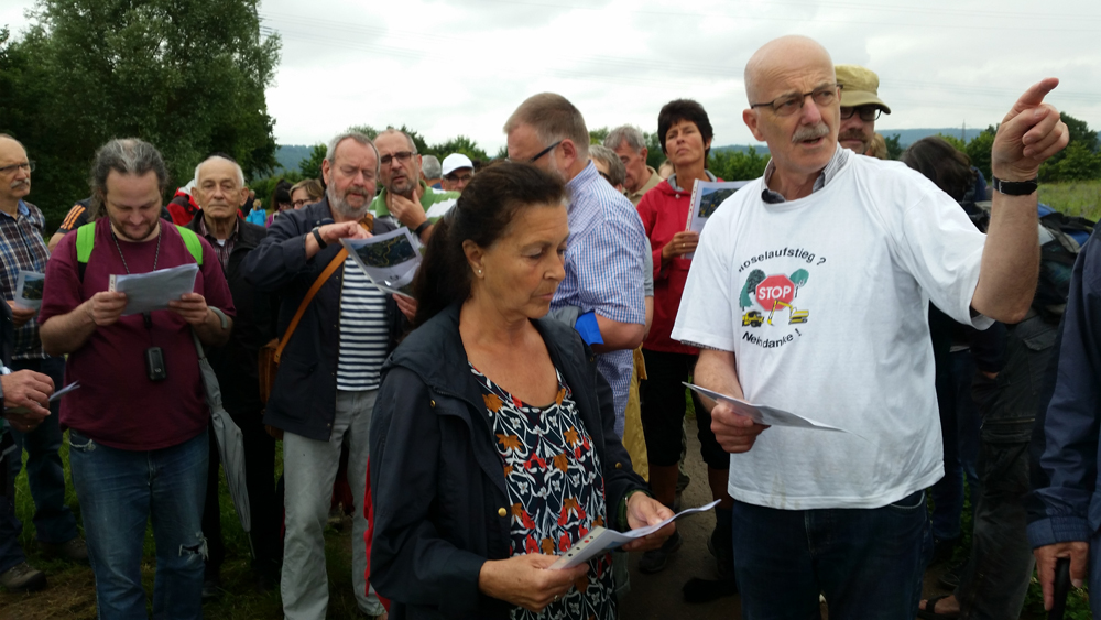 Etwa 40 Menschen aus Trier und Umgebung, darunter auch zahlreiche Grüne, haben sich Ende Juni auf eine besondere Wanderung begeben: Von der Mosel in der Nähe von Igel gegenüber der Saarmündung, über Wiesen vorbei am Tierheim in Zewen und weiter in den Wald in Richtung Herresthal. Man könnte meinen, die Tour sei ein ausgewiesener Rundwanderweg, denn es ist alles dabei, was eine schöne Tour ausmacht. Die Wander*innen folgen jedoch keinem Wanderzeichen, sondern den Plänen des so genannten Moselaufstiegs.