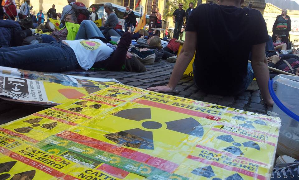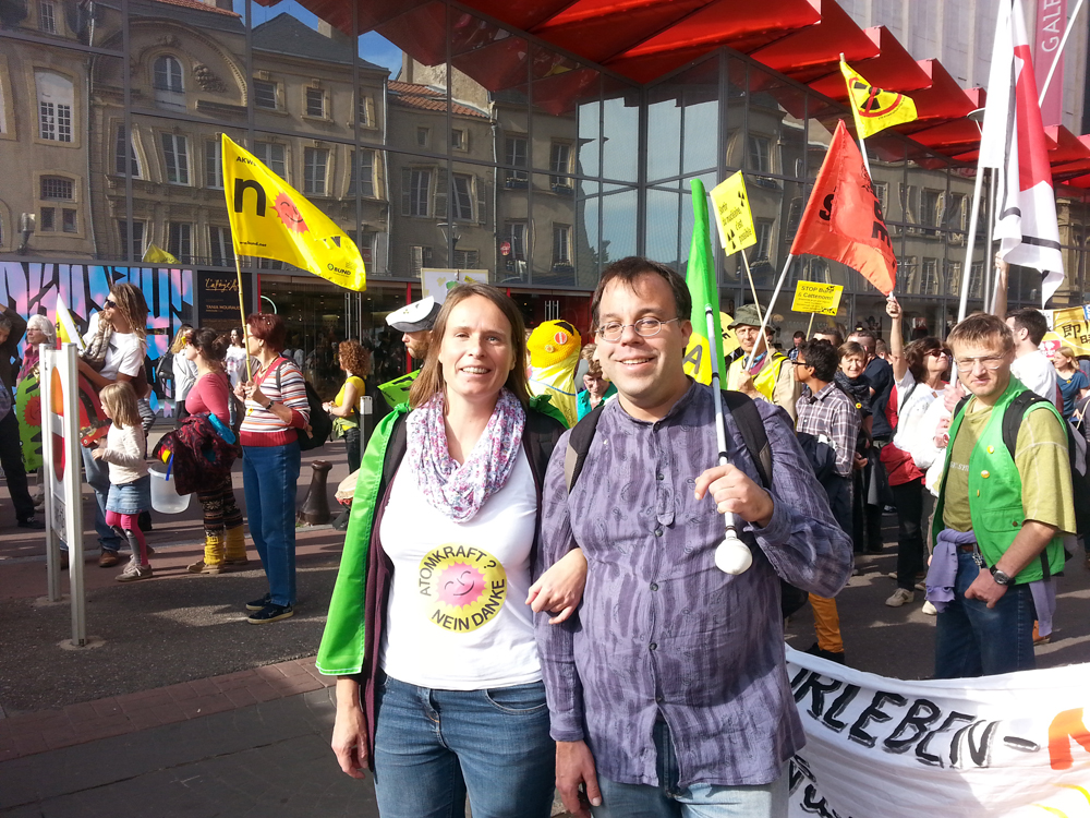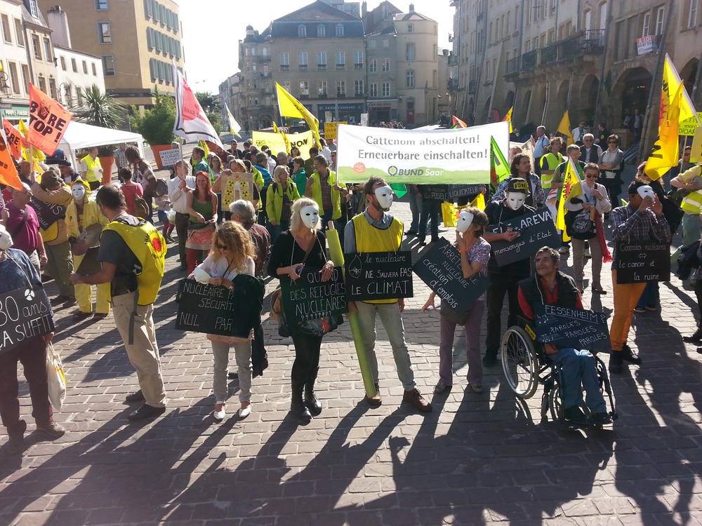Rund 300 Atomkraftgegner, halb aus Frankreich, halb aus Deutschland, darunter einige Grüne aus Trier, demonstrierten am 3. Oktober in Metz gegen den Atomkomplex Cattenom und das Endlagerprojekt Bure. Mit Fahnen, Transparenten, Konfetti und Trommeln, einigen Zwischenkundgebungen und einem Die-in zog die bunte Schar durch die Innenstadt der französischen Partnerstadt Triers in Lothringen.
