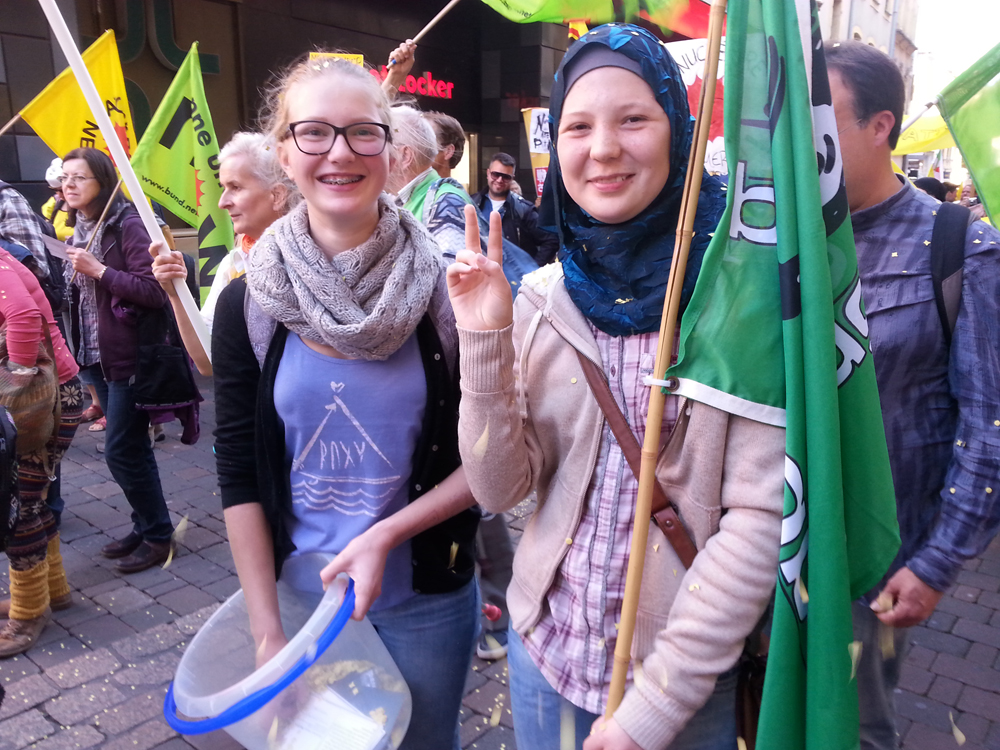 Markus Pflüger vom Antiatomnetz Trier und Ingrid Röder von Aktion 3. Welt Saar gingen in ihrem Redebeitrag auf den Zusammenhang zwischen Fluchtursachen und unser Wirtschafts und Energieproduktion mit endlichen Energieträgern ein. Sie fragten: ”Sind wir hier in der Großregion nicht das zukünftige Flüchtlingsdrama Europas bei einem möglichen Supergau im Schrottreaktor Cattenom oder der radioaktiven Verseuchung des Grundwassers durch das Atommüll-Endlager in Bure?“ Beispielhaft erläuterten sie, wie Atomkraft mit Polizeigewalt durchgesetzt wurde und auch Todesopfer forderte: ”Demokratie und die Risikotechnologie Atomkraft sind unvereinbar!“
