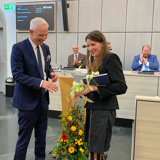 Unsere Fraktionsvorsitzende Dr. Anja Reinermann-Matatko sprach im Namen des gesamten Stadtrats. Sie lobte seinen persönlichen Einsatz in den vergangenen Krisen, Amokfahrt, Corona-Pandemie, Flutkatastrophe, und sein Geschick, bei Land und Bund immer wieder Geldtöpfe aufzutun, um Fördermittel in die Stadt zu ziehen. Und weil die Stadt immer so klamm ist und er auch künftig gut auf den Stadtsäckel aufpassen muss, überreichte sie im ein Haushaltsbuch sowie ein Sparschwein für die wichtigen Notgroschen.