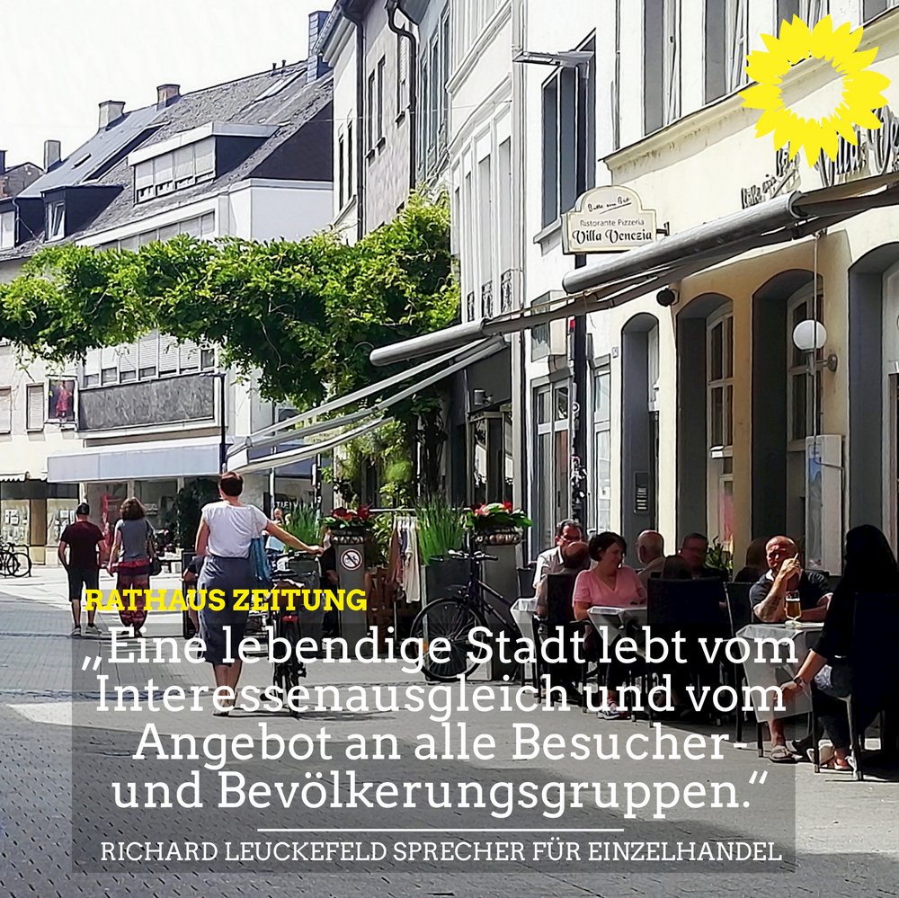 Die öffentlichen Flächen der Innenstadt gehören allen Bürger*innen der Stadt. Die Interessen des Einzelhandels sind genauso zu berücksichtigen wie die des Denkmalschutzes, die von Senioren*innen oder von Menschen mit Behinderungen. Eine lebendige Stadt lebt vom Interessenausgleich und vom Angebot an alle Besucher- und Bevölkerungsgruppen.